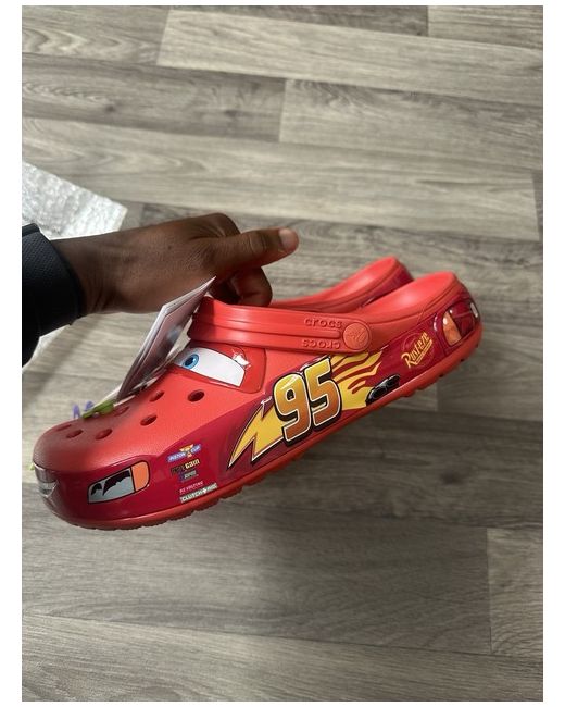 The Genuine & Authentic Crocs Lightning McQueen Clogs in UK size 9 (M10/W12) are a vibrant red pair of trainers featuring the iconic Lightning McQueen character from the Cars franchise. These Crocs Classic clogs are part of the Crocs product line and are perfect for casual occasions. The rubber upper material and sneaker style make them a comfortable and stylish choice for fans of Disney's Lightning McQueen. With a release year of 2025, these Crocs are a must-have for those looking to add a touch of personality to their footwear collection.
