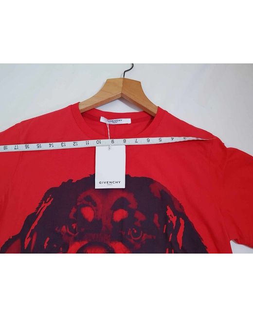 This limited edition Givenchy Rottweiler T-shirt is a must-have for any fashion-forward individual. Made with lightweight jersey cotton, this handcrafted shirt features a bold red colour with an animal print pattern of the iconic Rottweiler character. The shirt has a crew neckline and short sleeves, making it perfect for all seasons. The shirt is available in size L, fitting regular size individuals. It has been manufactured in Portugal between 2010-2019 and is a part of Givenchy's designer product line. The shirt has been personalised with stars, adding a unique touch to the shirt. Handwash the shirt only to maintain its quality.