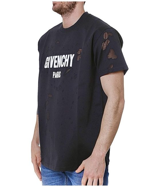 Cotton jersey crew neck T-shirt detailed with destroyed areas. Fit on smaller side, unisex adult.