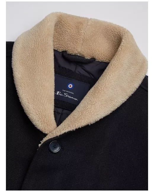Cloth Composition: 49% Wool 44% Polyester 7% Mixed Fibres. Lined with quilting and featuring an on-trend contrast wrap around borg shawl collar, this jacket is finished with a button front fastening and front welt pockets.
