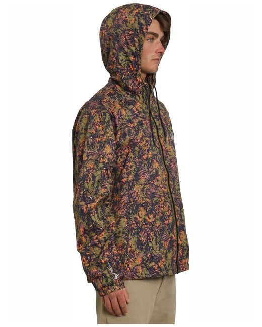 Also features 2 pockets and all over print as well as drawstring hood DWR coating elastic cuffs elastic hem internal pocket and zip closure. Made from nylon and polyester.. Volcom printed logo. Drawstring adjustable hood.