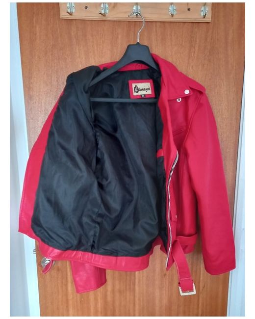 Red Faux Leather Belted Jacket. Lined With Polyester Inside. Belt With Buckle Along The Waist. Stylish And Attractive.