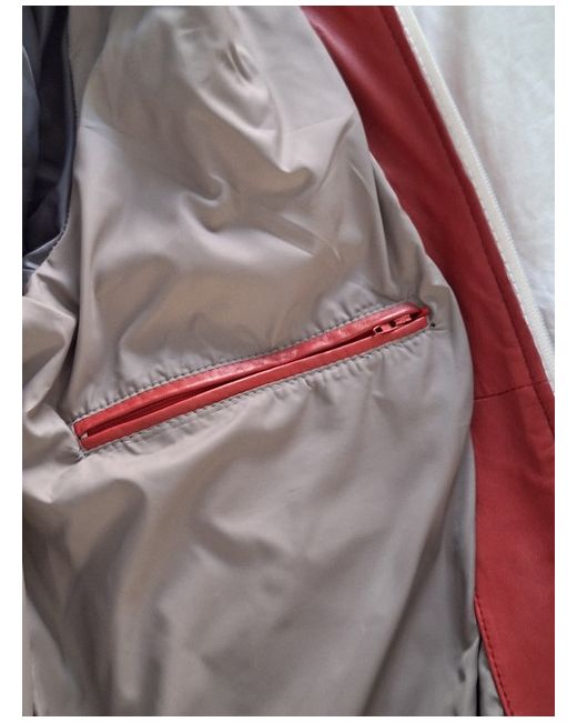 This is a Redpoint brand men's jacket in size 42" Regular, made of soft lambs leather in a striking red color. It features a biker style with quilted detailing and a polyester lining. Two internal pockets - one with zip and one button down. Two external zip pockets. Brand new, never worn.