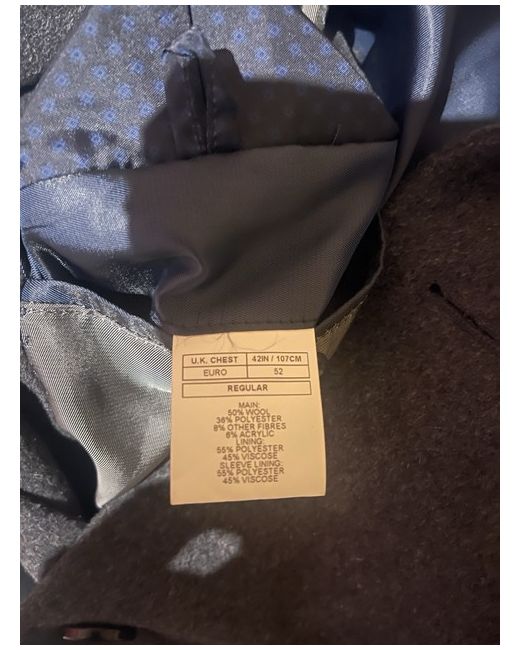 This men's coat by Moss Bros is a stylish overcoat crafted from wool in a classic grey colour. It features a button closure and accents, making it suitable for casual occasions during the winter season. The coat is designed in a size 42, suitable for regular-sized men, and is perfect for walking in colder weather. With its timeless design and quality material, this coat is a versatile addition to any man's wardrobe. One button is missing