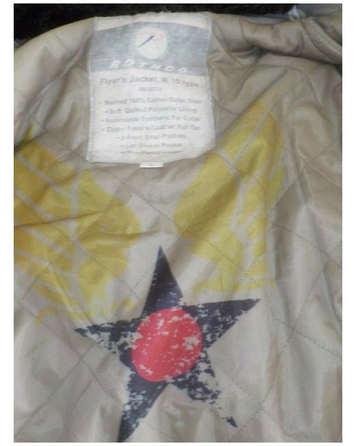 Flyer's Jacket, B-15 type - RN35752. 2 Front Snap Pockets. I am not an expert on jackets. . I bought it because it looked cool. Washed 100% Cotton Outer Shell. Zipper Front with Leather Pull Tab.