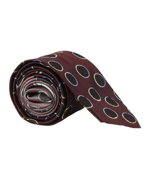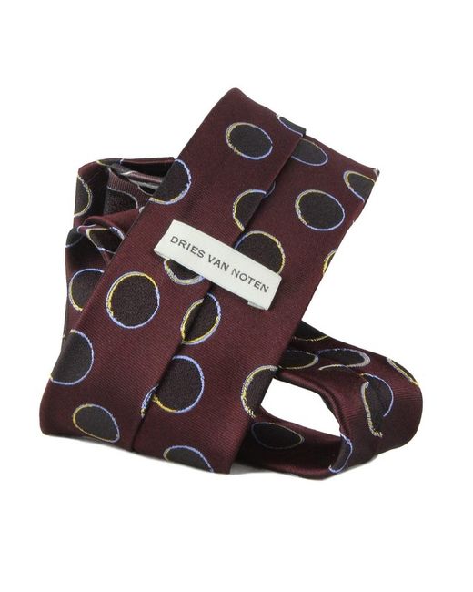 Dries Van Noten Tie Dries Van Noten x Len Lye Dot Patterned TieColour: Burgundy tones, pale blue, yellow and pale greyMade in ItalyMaterial: 100% silkBlade width: 6 cmDries Van Noten x Len Lye irregular dot patterned narrow silk tieContrasting dark dusky pink and pale grey twill stripe patterning to narrow part of tie.