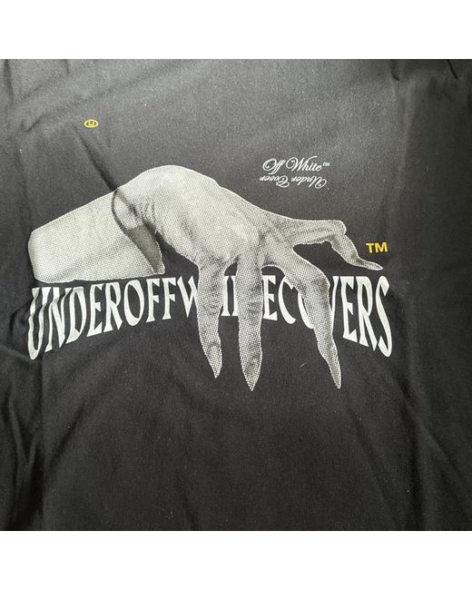 The Off White Undercover Dart Hand tee is a stylish and unique men's T-shirt featuring a striking dart design. This regular fit tee from Undercover comes in a classic black colour with a size small, making it versatile for various casual outfits. perfect for those who appreciate edgy and contemporary fashion choices. 2x available 1x large 1x small