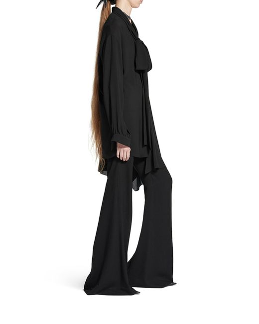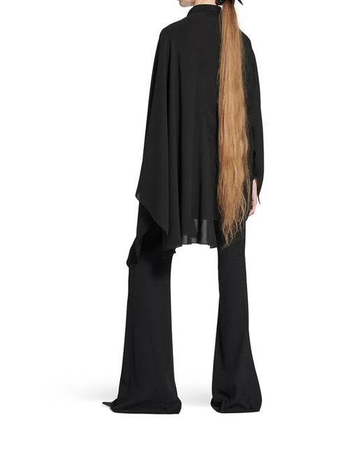 -Faded silk georgette-Lavaliere collar-Asymmetrical construction-Tone-on-tone covered buttons on the front-1 classic buttoned sleeve-1 batwing sleeve-Oversize-Black