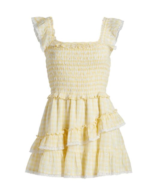 Crafted of cotton, this Aline gingham dress from LoveShackFancy is styled with a square neck, a shirred bodice, and ruffle detailing. The mini-length piece is decorated with intricate eyelet embroidery. Square neck Ruffle straps Shirred bodice Pulls over 100% cotton Hand wash Imported SIZE & FIT About 29.5" from shoulder to hem Model measurements: 5'10" tall Model is wearing a US size Small. Contemporary Sportswear - Trend > Loveshackfancy > Saks Fifth Avenue > Barneys. LoveShackFancy. Color: Honeycomb. Size: XXS.