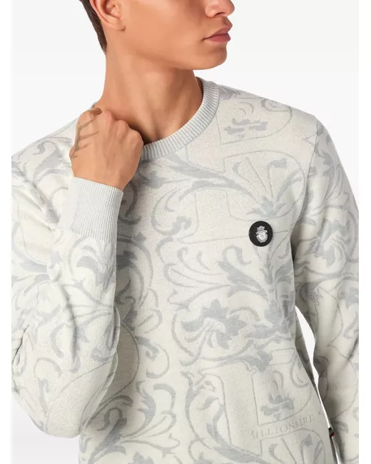 white jacquard pattern crew neck long sleeves ribbed cuffs and hem logo patch at the chest