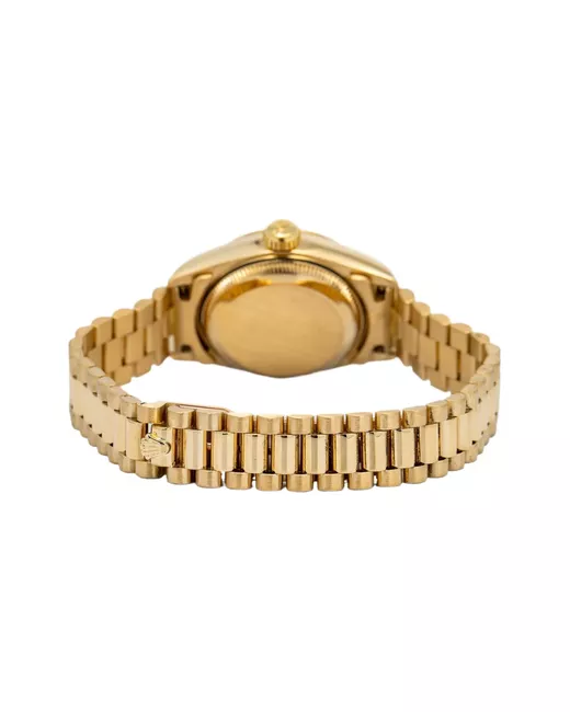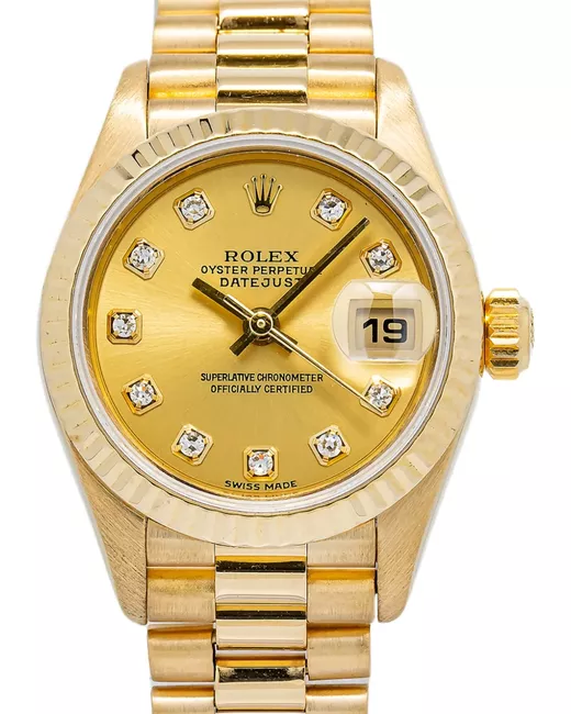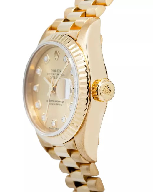 champagne dial yellow gold case round face fluted bezel diamond hour markers date window automatic movement The original box and papers are not included. This item comes with a standard one-year warranty from the boutique. Condition: EXCELLENT. This previously owned item is in near-perfect condition with no signs of damage or use.