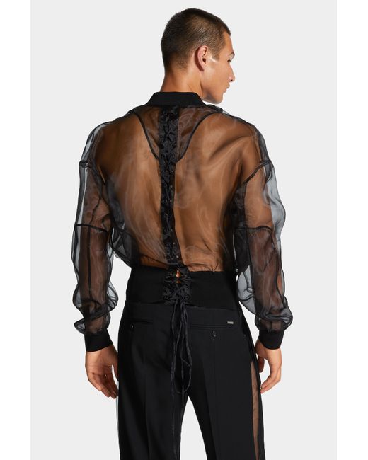 The iconic bomber jacket is reworked in daringly sheer organza for a statement evening look that's guaranteed to turn heads. Maxi utility pockets on the front contrast with corset-style ties on the back.