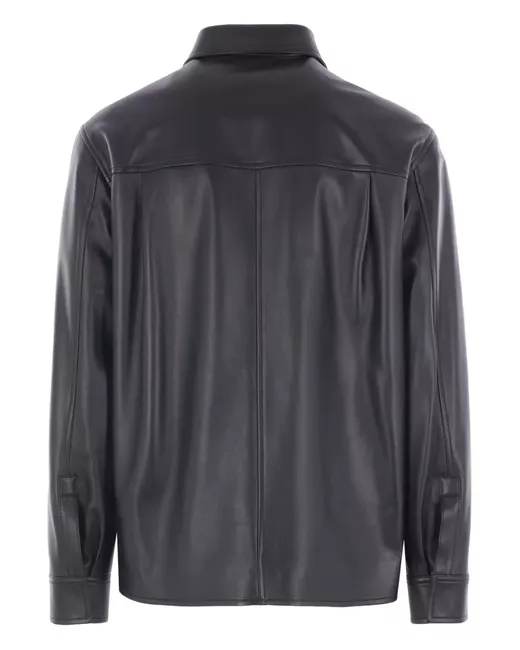 black leather button fastening shirt collar chest patch pocket centre seam detail