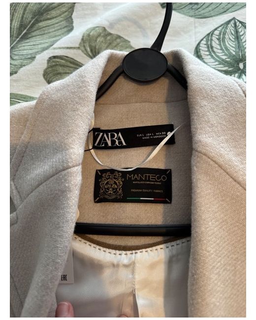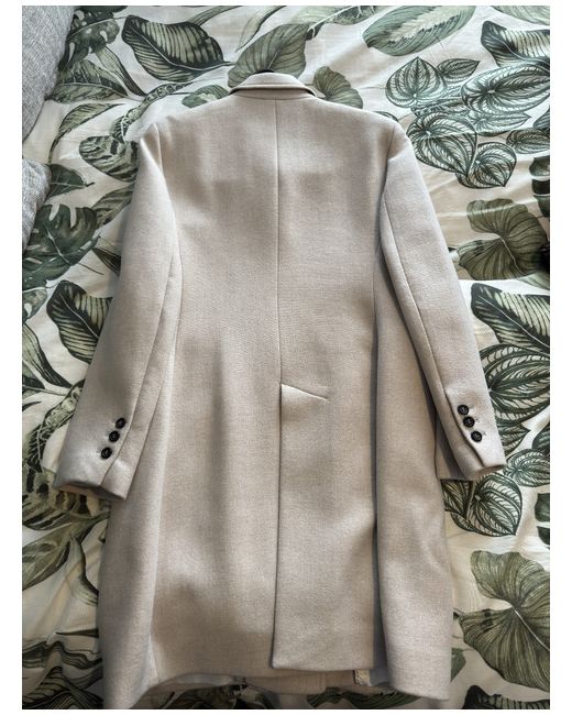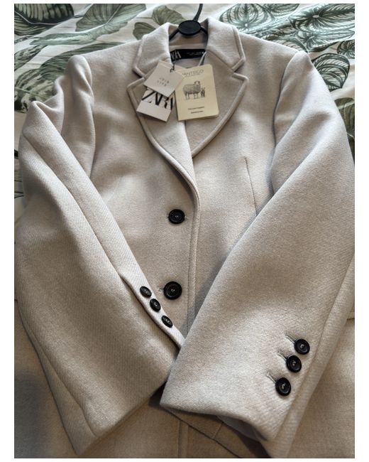 A Zara women's long coat in size L, made from wool in a beige colour. This overcoat features a classic style, perfect for colder weather.