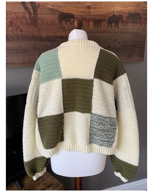 This handmade crochet patchwork oversized medium cardigan in green and cream is a stylish and unique addition to any casual wardrobe. Made from acrylic soft yarn, the cardigan features long balloon sleeves and an open neckline with no fastening, making it perfect for all seasons. The oversized fit features dropped shoulders and adds a comfortable, cosy, relaxed feel, while the crochet accents give it a touch of handmade charm. Ideal for autumn, winter, and spring and summer evenings, this cardigan is a versatile piece that can be dressed up or down to suit any occasion. Made in the United Kingdom, it is a truly special and one-of-a-kind item. Measurements. Armpit ~ Armpit = approximately 72cm Shoulder ~ Cuff = approximately 72cm Shoulders ~ Hem = approximately 48cm