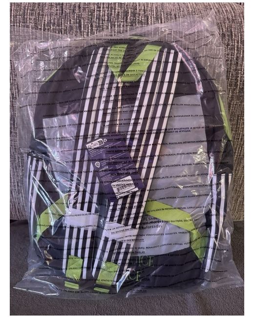 His applique face rises up over the top, and the stripes continue around on the side pockets. On the back, you’ll find “Beetle.