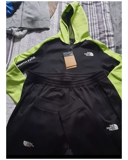 hoodie jacket size LARGE AND BOTTOM SIZE XL legate your activewear game with this stylish black tracksuit from The North Face. Designed for women, this size L tracksuit is perfect for any occasion, whether you're hitting the gym or running errands. Made from high-quality materials, this tracksuit is both comfortable and durable, ensuring that it will last you for many wears to come. The set includes a long-sleeved top with a zip-up front and matching bottoms with an elasticated waistband. The brand's signature logo is subtly embroidered on the chest, adding a touch of sophistication to this versatile tracksuit. Whether you're a seasoned athlete or just looking for a comfortable and stylish tracksuit, this North Face set is the perfect addition to your wardrobe.