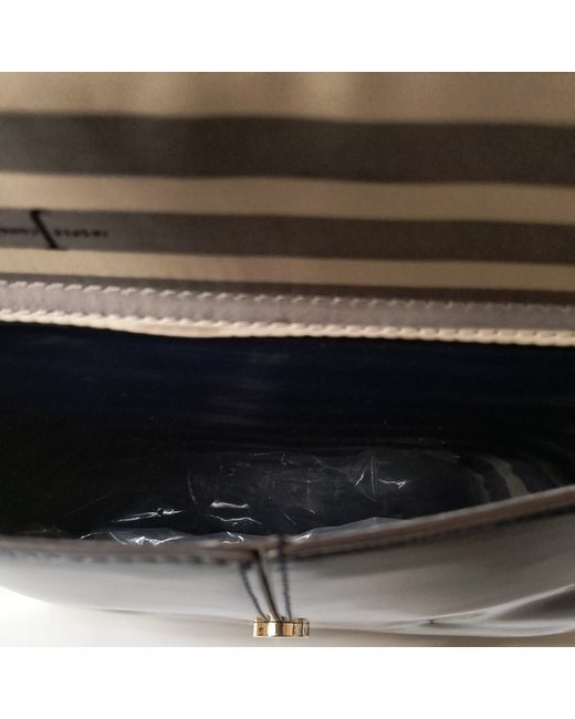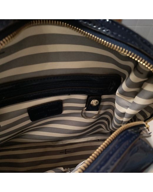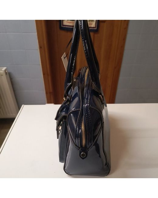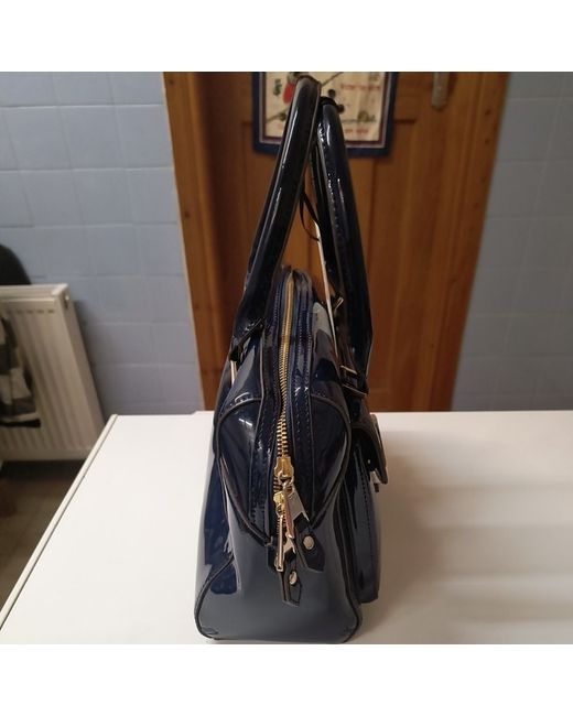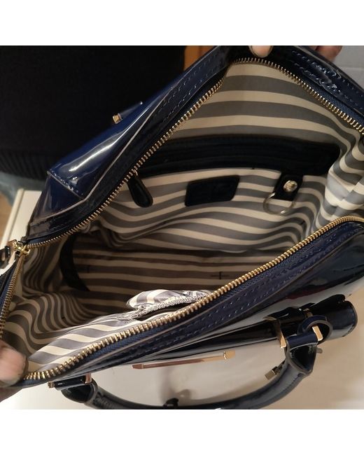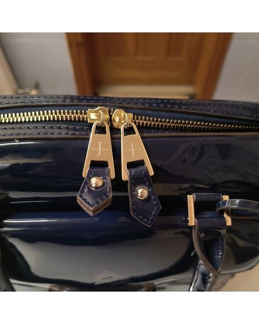 new and tagged Jasper conran large bowler bag glossy navy finished couler wipe clean only zip closure handle bag only no strap requirements 1 X small zip enclosure inside and small pocket keyring holder inside bag to attach keys grey and white stripe inside zip closure both sides button open at front for accessories 4 x studs at bottom length is approx 34 cm height is approx 25 cm width approx 15 cm