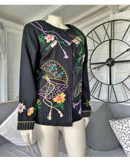 Stunning jacket by Indigo Moon Black fabric with embroidery Fitted shoulder pads Front button/bead fastening Long sleeves 52% Cotton / 48% Viscose lined in polyester Indigo Moon jacket in size M Measures 25" Long from shoulder to hem down back Measures 21" From armpit to armpit across back laid flat Measures 20" approx across waist area laid flat Measures 18" Armpit to sleeve cuff Worn but in fantastic condition.