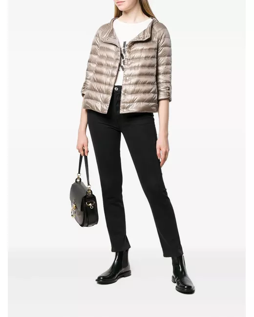 Herno’s revolutionary avant-garde technology and “functionality over aesthetic” philosophy made an immediate and deep impact on the luxurious fashion industry. This brown feather down and cotton blend 3/4 sleeve padded jacket from Herno features a bateau neck, a concealed front fastening, button cuffs, a padded interior and a short length.