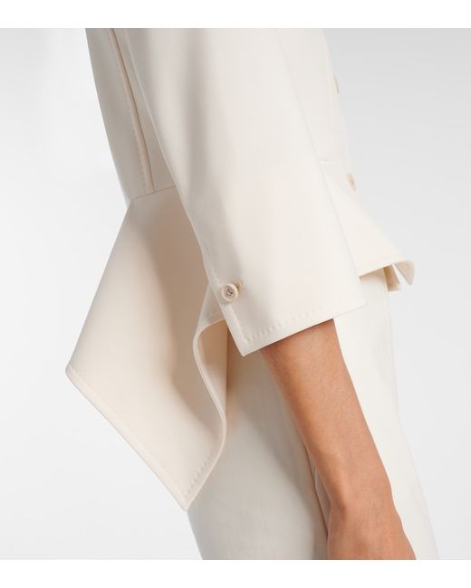 Material: 90% polyester, 10% elastane. Care instructions: dry clean. Made in Italy. Designer color name: Tela. Item color: beige. Lining: 65% acetate, 35% polyester. Contains non-textile parts of animal origin. Collar: classic (Straight point). Cuff: buttoned. Closure: buttoned front. Hem: uneven.