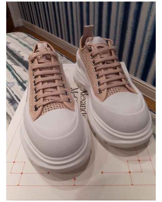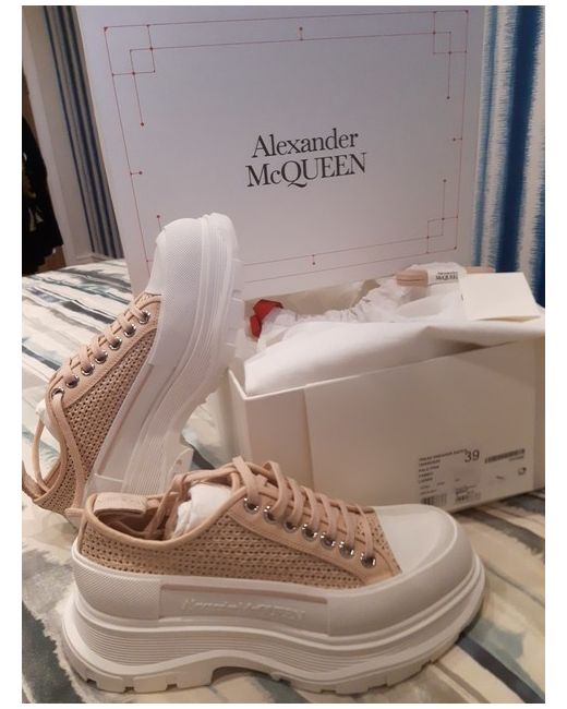 Worn once inside, not outside, so slight marks on soles, but otherwise perfect condition, size 39 blush and white Alexander McQueen trainers. In original box with shoe bag, extra laces and authentication booklet. Fab colour, chunky sole and look great with wide jeans/cargos or maxi dress or skirt. RRP as shown on box £620.00
