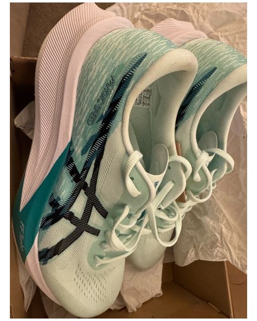 The Magic Speed 4 Men's Running Shoes by ASICS in green are a stylish and functional choice for active men. With a UK shoe size of 10, these sneakers are perfect for running or everyday wear. The design combines comfort and performance, making them ideal for those who value both style and functionality in their footwear. The iconic ASICS branding adds a touch of quality and reliability to these trendy green trainers. Not original box