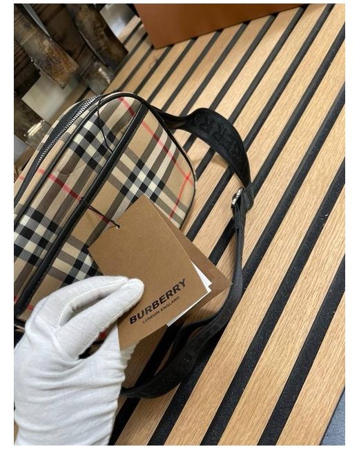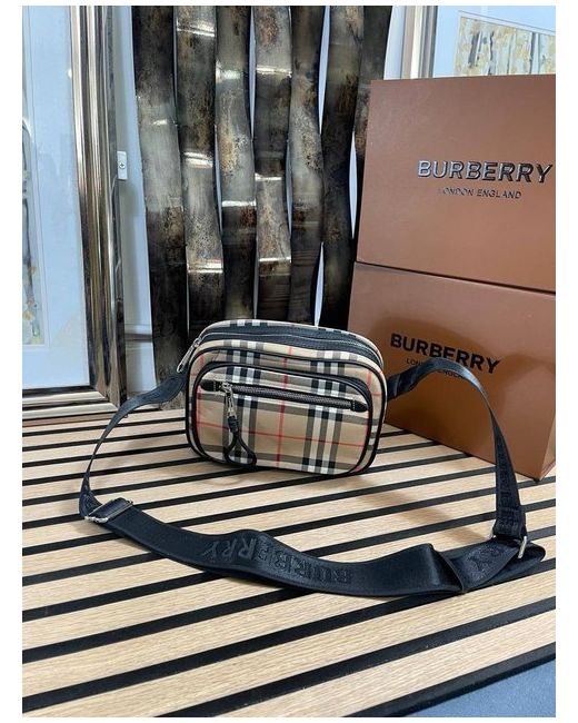 The Burberry Man Bag is a stylish messenger bag designed for men, featuring a classic checkered pattern in beige leather with a zip closure. The bag is made from high-quality materials such as canvas and leather, accented with stainless steel hardware. This designer piece from the Burberry House collection is crafted in Italy, making it a sophisticated and timeless accessory for any modern man. The leather handle/strap adds a touch of luxury, making this bag a must-have for those who appreciate quality craftsmanship and understated elegance.