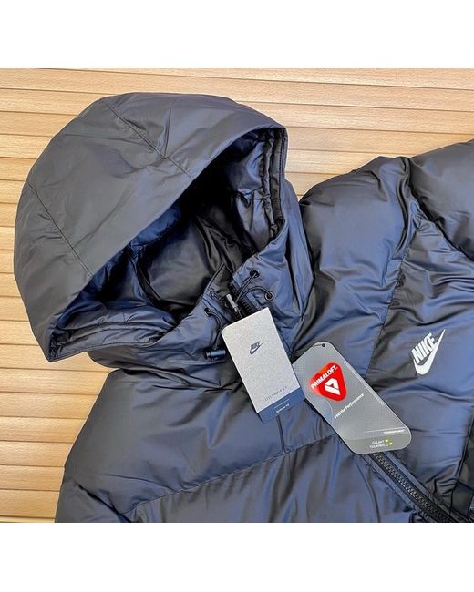 Style: Standard-fit Windrunner puffer jacket. Other features: Full-length storm flap over the front zip. Embroidered Nike Futura logo on the left of the chest. Trim: 2-way front zip; elastic cuffs and hem; bungee-adjustable hood.