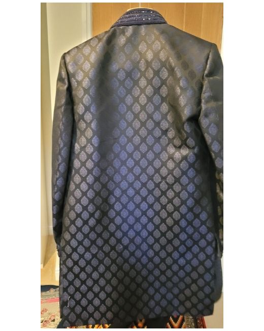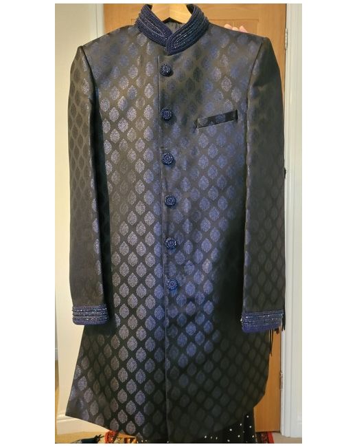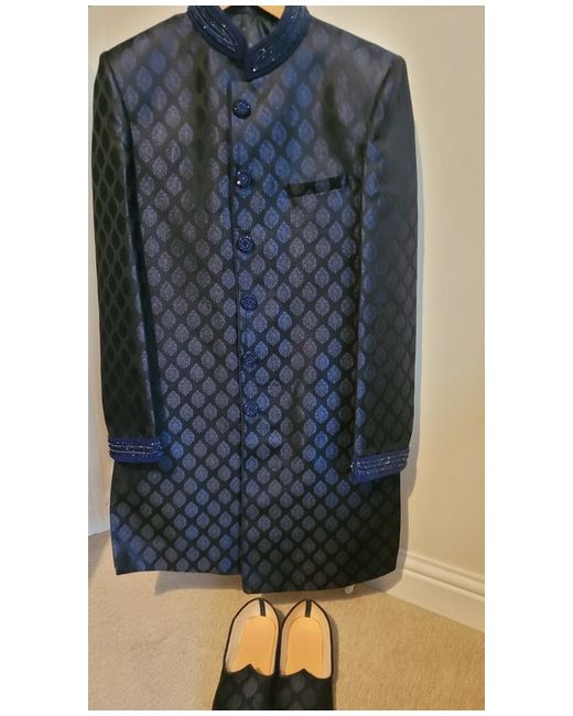 This designer set includes a blue quilted outfit in size M, perfect for a wedding or any special occasion. The collared top features long sleeves and button closure, while the blended fabric and 100% modal material ensure comfort and style. The set is made of 1 piece and has a regular fit, suitable for unisex adults. The vintage theme adds a touch of elegance, and the outfit is perfect for personalizing. The set is not handmade and comes without tags. The fabric type is blended, and the set is made of high-quality materials, ensuring durability.