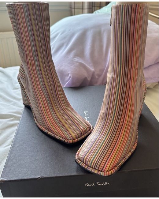 They have a beautiful multi-coloured stripe design, which is iconic, striking and unusual. They have a square toe with piping around the edge and the leather is buttery soft. They are a uk size 5 (38), but are quite small for the size and have a zip up the inside for easier access with the Paul Smith logo on them.