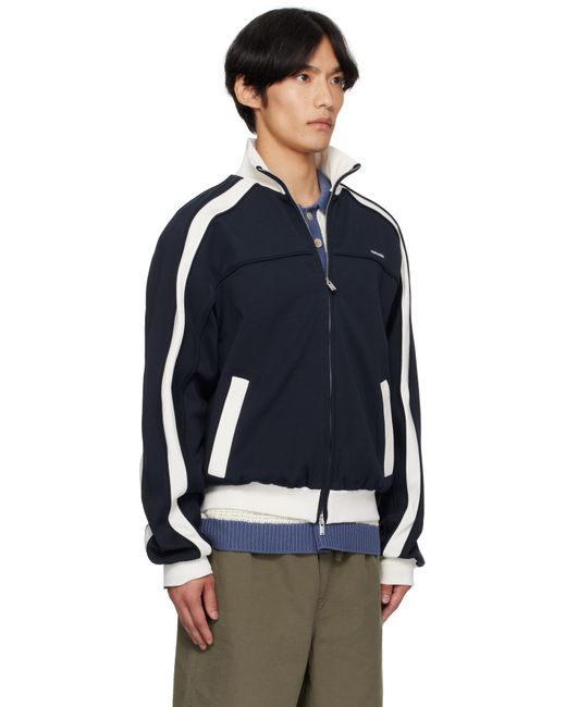 Cotton-blend double-faced jersey track jacket. · Rib-knit stand collar, hem, and cuffs · Two-way zip closure · Logo printed at chest · Welt pockets at waist · Piping and paneled stripe at yoke sleeves and back · Full mesh lining Supplier color: Navy