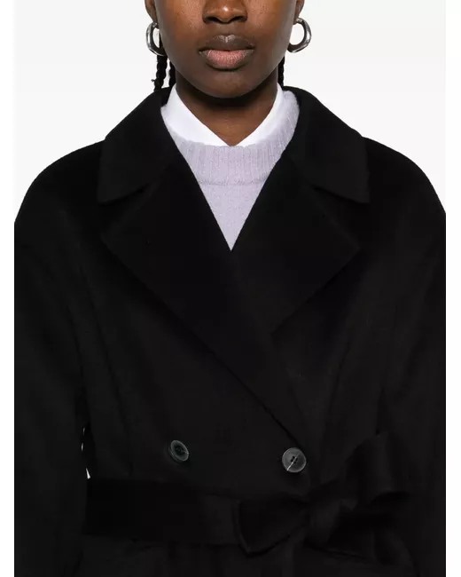 black double-breasted fastening self-tie belt notched lapels long sleeves straight hem