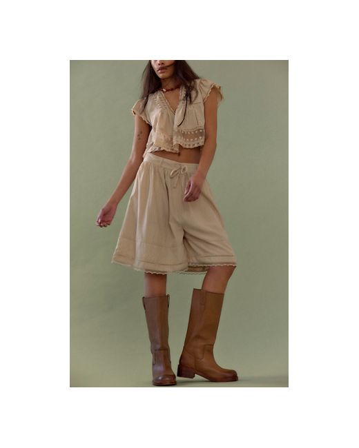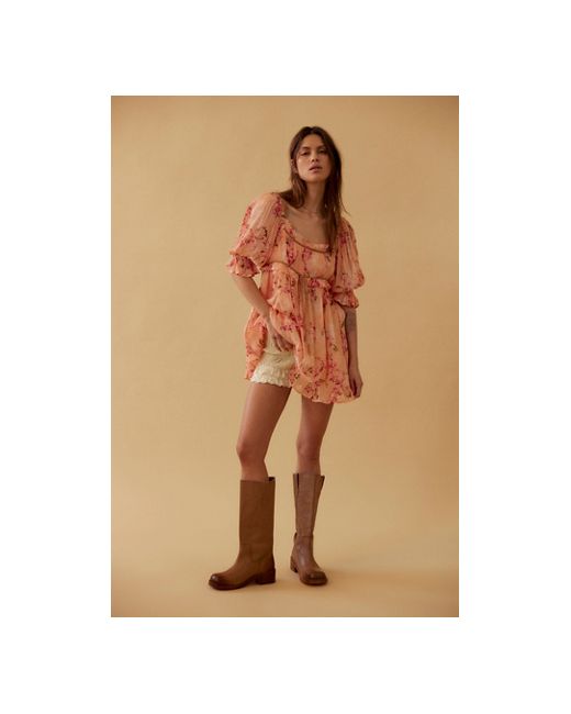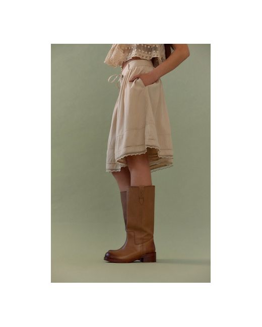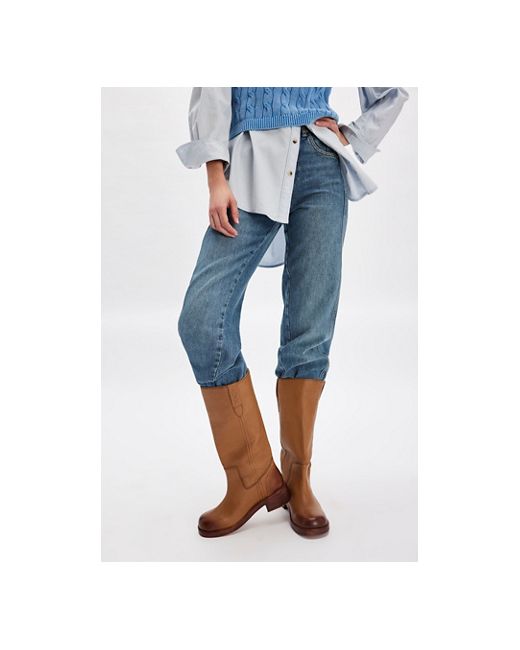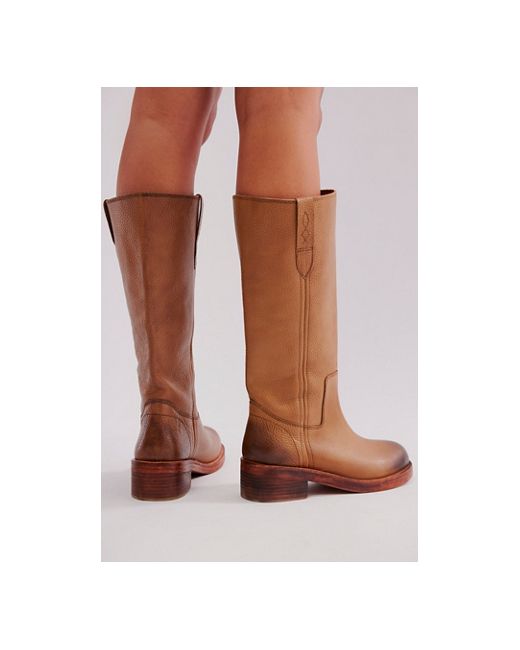 Go vintage in these campus-inspired boots, featured in a tall pull-on style with a squared-off toe and stacked leather sole, complete with distressed details for a lived-in look. **Features:** Pull-on style, tall design, leather uppers, pull straps with embroidered details, square toe, fading at heel and toe, stacked leather block heel **Why We Blaze Pull-On Boots by Free People in Toasted Wheat, Size: US 6