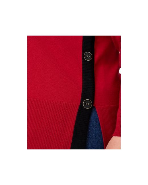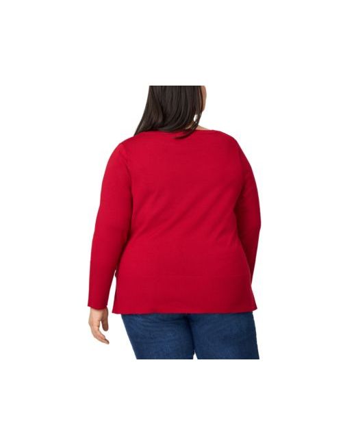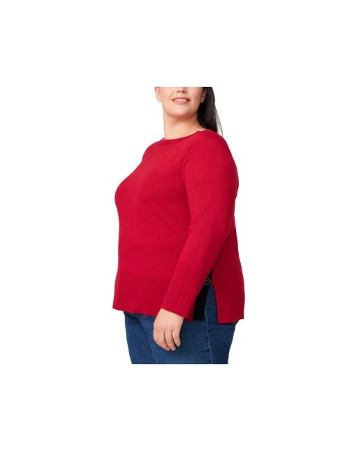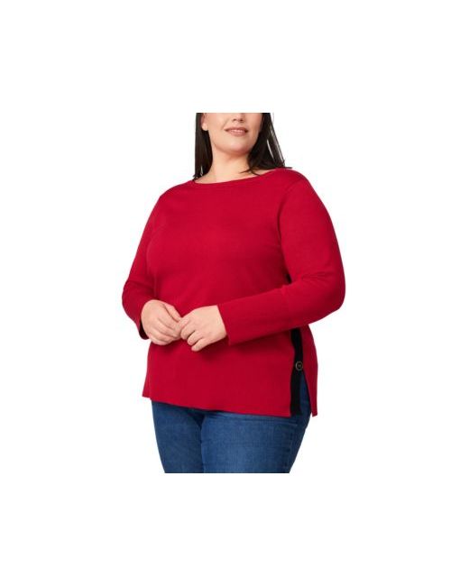 Finished with contrast and button trim at the side, Melissa Paige's lightweight plus size tunic sweater pairs with leggings, pants, or skirts.