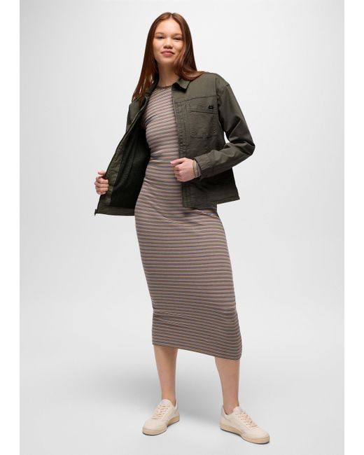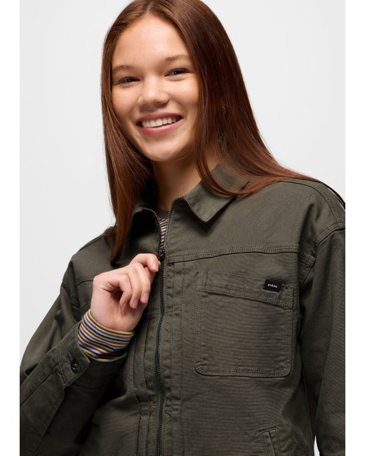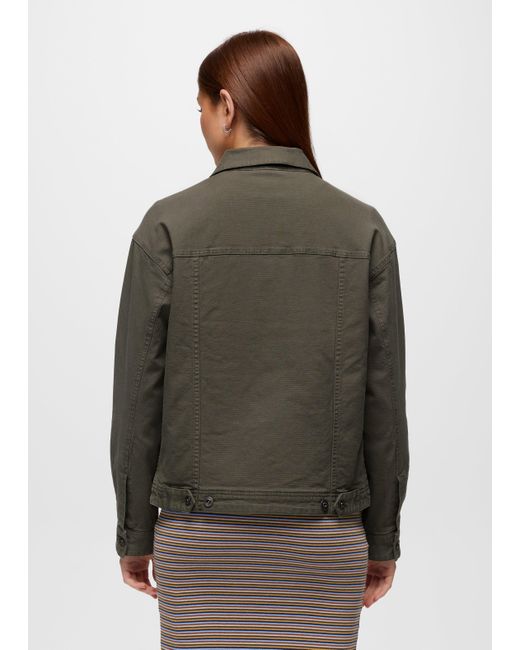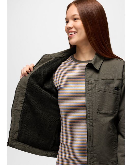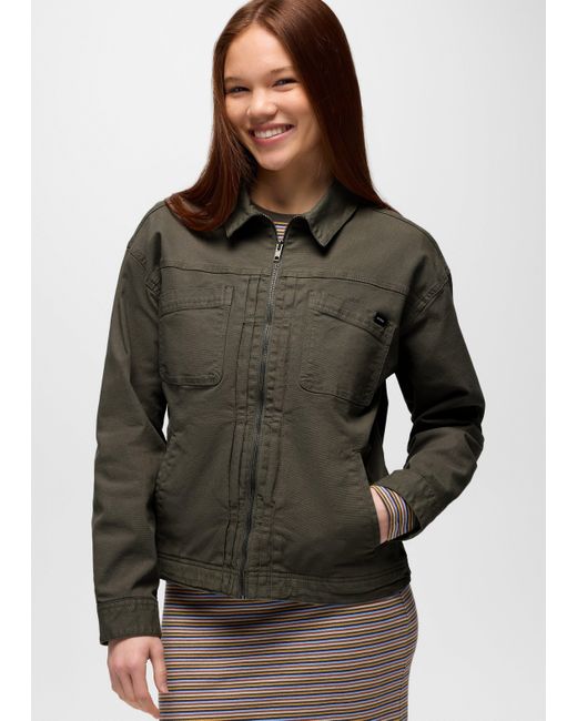 Workwear-inspired style in a standard-fit canvas jacket with soft flannel lining and washed down effect. Embrace cool-weather walks and daily commutes with the Rock Ridge Jacket. Inspired by traditional workwear, this standard-fit zip-up jacket is made with a stretch canvas from organic and recycled cotton. It features two chest pockets, two hand pockets, and a flannel-lined body and taffeta-lined sleeves for elevated comfort. | Womens prAna Rock Ridge Jacket in Gray, Size Large