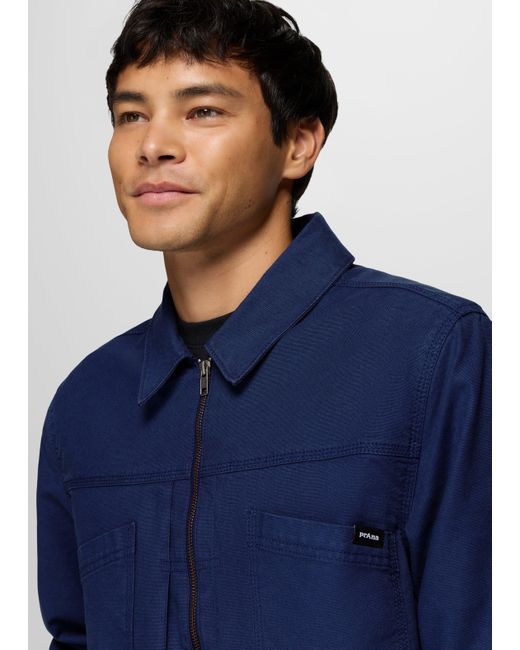Workwear-inspired style in a standard-fit canvas jacket with a soft flannel lining and washed down effect. Embrace cool-weather walks and daily commutes with the Rock Ridge Jacket. Inspired by traditional workwear, this standard-fit zip-up jacket has a washed dpwn effect and is made with a stretch canvas from organic and recycled cotton. It features two chest pockets, two hand pockets, a flannel-lined body, and taffeta-lined sleeves for elevated comfort. | Mens prAna Rock Ridge Jacket in , Size Medium