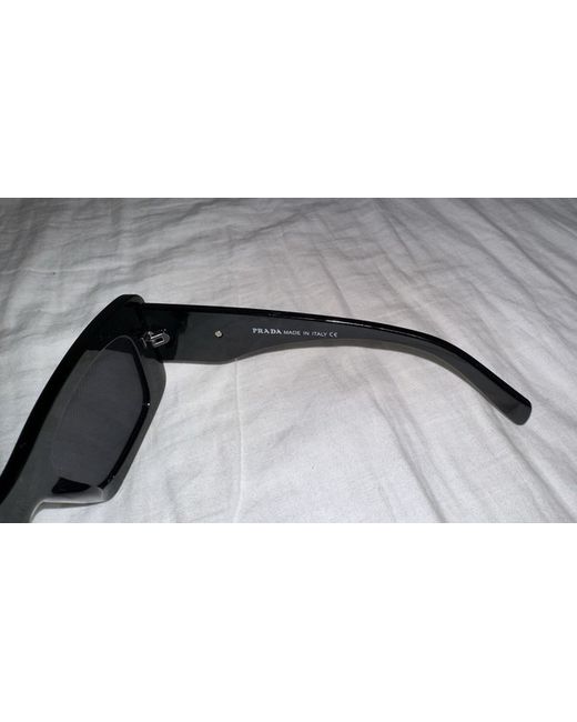 A close-up of a pair of black Prada sunglasses, showcasing the distinctive Prada triangle logo on the temple, lying on a light-colored, textured fabric. #PradaSunglasses #LuxuryEyewear #DesignerFashion #Prada #FashionStatement