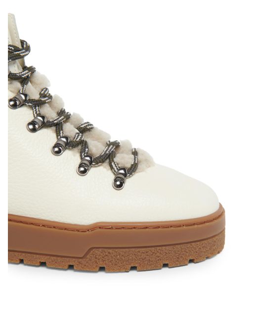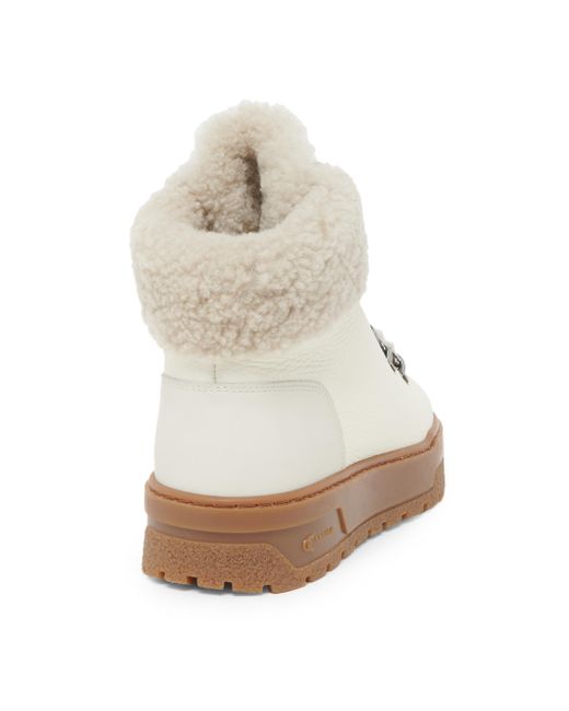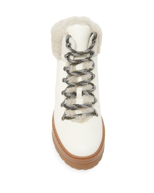 These platform boots from Pollini are crafted of supple leather and feature a round toe, plush shearling trim, and a chunky rubber sole. Round toe Lace-up style Leather upper Leather lining Shearling trim Rubber sole Fur type: goat fur Fur origin: China Made in Italy SIZE Heel: about 1.75" (45mm) Platform: about 1.75" (45mm). Women's Shoes - Designer Womens Shoes > Pollini > Saks Fifth Avenue. Pollini. Color: Ice. Size: 6.
