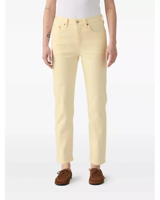 pale yellow cotton blend fabrication leather patch five-pocket styling button fly straight leg