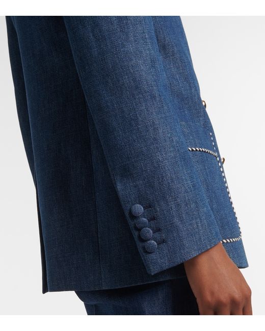 Material: 100% cotton. Care instructions: dry clean. Made in Italy. Designer color name: Blu Medio. Item color: blue. Lining: 75% acetate, 25% silk. Sleeve lining: 100% viscose. Trim: 71% cotton, 16% polyester, 13% acrylic. Hardware color: gold. Peak lapel. Cuff: four buttons. Pockets: patch pockets, internal pockets, breast pocket. Vent: single. Closure: double-breasted (four buttons). Contains non-textile parts of animal origin. Cotton.