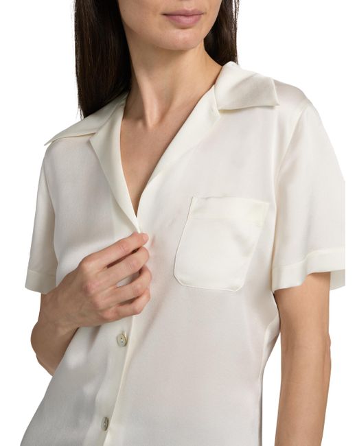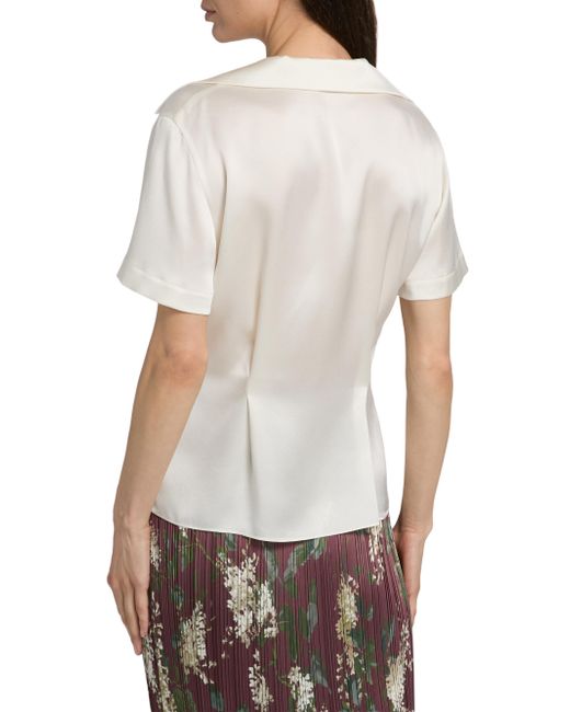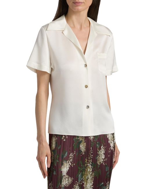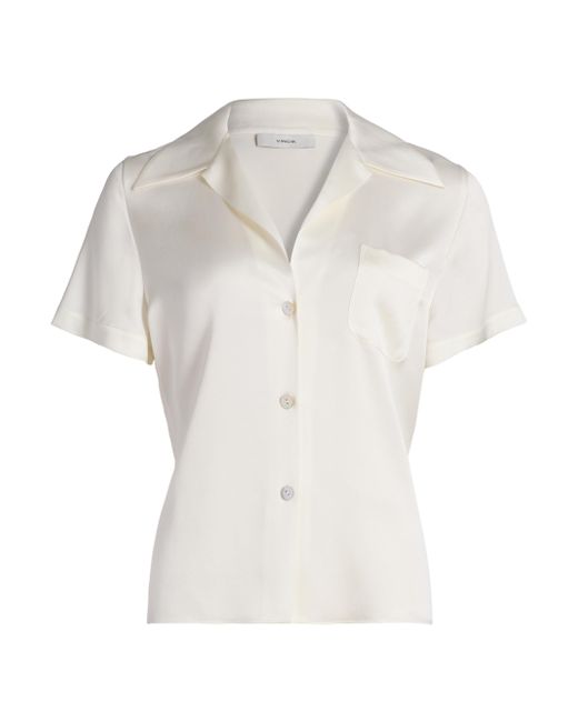 Crafted of lustrous silk, this button-front shirt from Vince is styled with an spread collar and back darts for added shape. Spread collar Short sleeves Button-front closure 100% silk Hand wash Imported SIZE & FIT About 24.75" from shoulder to hem Model measurements: 5'10" tall Model is wearing a US size Small Please note: This brand fits slightly larger. Consider ordering a half size down. Contemporary Sportswear - Vince > Vince > Saks Fifth Avenue. Vince. Color: Off White. Size: Large.