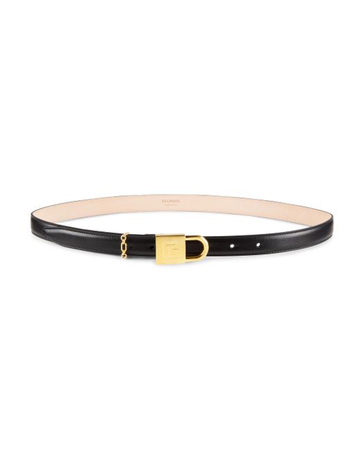 Crafted of Italian leather, Balmain's luxurious Sync belt highlights the thin strap with a goldtone padlock logo-engraved buckle and a chain keeper. Goldtone buckle Leather Made in Italy SIZE About 0.75" width ABOUT THE BRAND In 1945, founder Pierre Balmain made his well-received debut of opulent, ultra-feminine designs. Known today for its iconic blazers, impeccably constructed dresses and signature fragrances, the brand continues its dedication to masterful tailoring and elegance under the helm of Creative Director Olivier Rousteing. Soft Accessories - Belts > Balmain > Saks Fifth Avenue. Balmain. Color: Black. Size: Small.