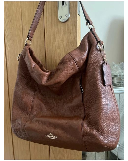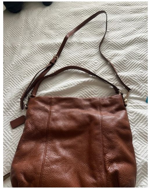 The Coach Leather Shoulder Bag is a stylish and practical accessory for women. Made from high-quality brown leather, this medium-sized rectangular bag features a zip closure and a comfortable shoulder strap handle. The gold hardware accents add a touch of luxury, while the inner pockets provide extra storage for your essentials. Perfect for casual occasions, this designer bag by Coach is a timeless piece that exudes sophistication and practicality.
