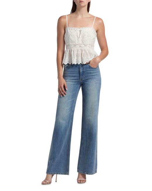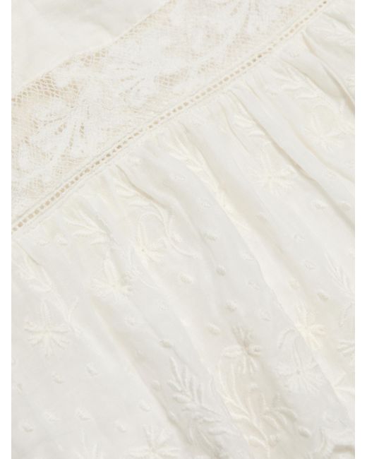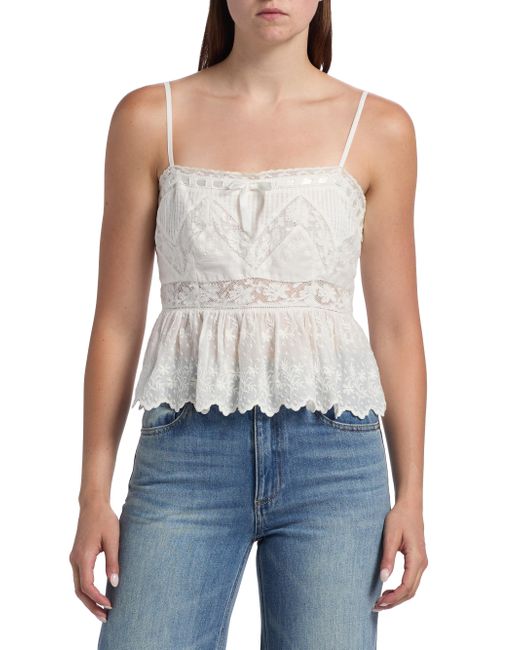 LoveShackFancy's Rowina top is crafted of intricately embroidered panels of cotton lace. A threaded satin ribbon accents the straight neck, while a scalloped hem lends added detail to this style. Straight neck Adjustable spaghetti straps Pulls over 100% cotton Hand wash Imported SIZE & FIT Model measurements: 5'10" tall Model is wearing a US size 4. Contemporary Sportswear - Trend > Loveshackfancy > Saks Fifth Avenue. LoveShackFancy. Color: Optic White. Size: 0.