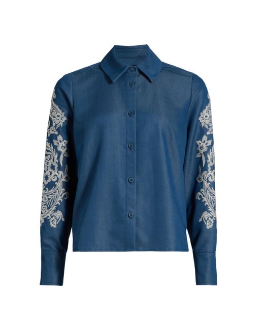 This button-front shirt is crafted of woven chambray and features embroidered sleeves. Spread collar Long sleeves, button cuffs Button-front closure 68% ramie/32% polyester Dry clean Imported SIZE & FIT About 23.5" from shoulder to hem Model measurements: 5'10" tall Model is wearing a US size Small. Contemporary Sportswear - Private Label Contempora > If Only Studio > Saks Fifth Avenue. If Only Studio. Color: Blue Ecru. Size: XS.