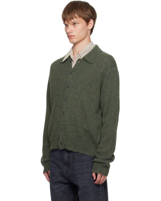Knit alpaca-blend cardigan. · Rib-knit spread collar, hem, and cuffs · Button closure · Mother-of-pearl hardware Supplier color: Moss green fuzzy