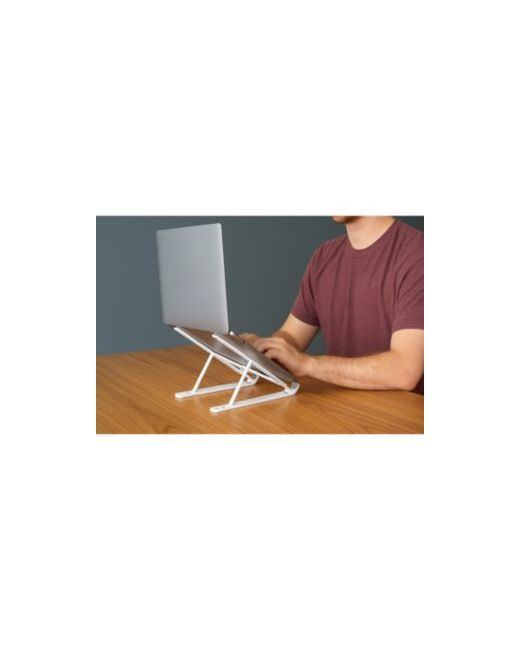 Compact, foldable stand with 10-level height and width adjustment. Stable double-triangle structure. Anti-skid pads, airflow-friendly open design. Reduces strain on eyes, hands, neck. Made of Abs and silicone. Size: 11"x2.25"x.75" (folded), Colors: Black, White. Carry bag included.