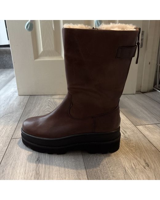 These women's leather boots by NEXT are a stylish and practical choice for the winter season. With a mid-calf shaft style and round toe shape, they are perfect for casual occasions. The brown colour adds a touch of elegance, while the zip closure and leather upper material ensure durability and comfort. The insole and lining, made of leather and fur respectively, add to the overall quality of the boots. These platform boots are a must-have for any woman looking to stay warm and fashionable during the colder months.
