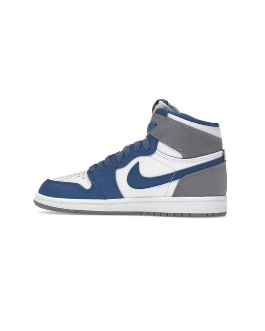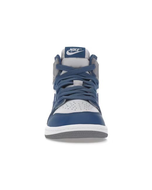 Blue tumbled leather overlays the toecap, vamp, and eye stays, while grey leather overlays the heel and collar. The blue OG Wings logo stamped on the lateral side collar matches the tumbled leather Nike swoosh on the side panel.